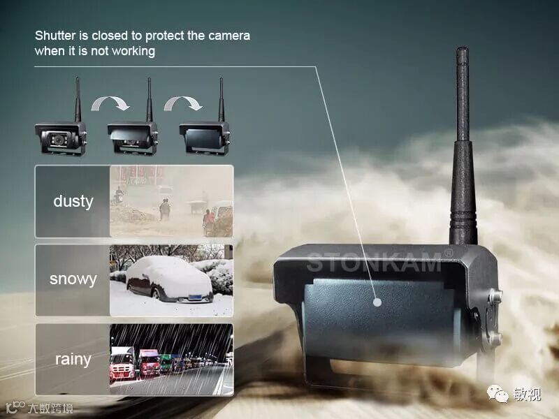 敏视无线马达摄像头不仅IP69K防水防尘,而且带有自动翻盖功能,正常显示时自动打开盖子,断开连接或关掉电源时自动关闭盖子以保护镜头,特别适合在雨雪天气、灰尘等各种恶劣环境中使用。