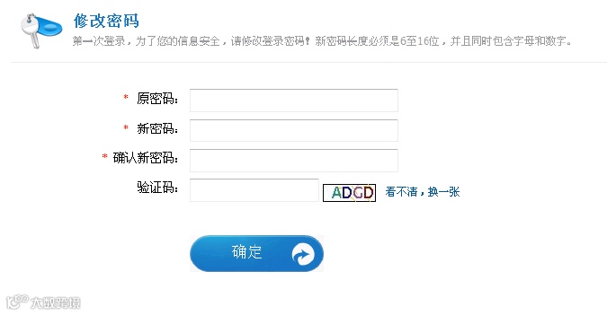 用户注册效验完后,系统弹出密码修改框,提示并要求用户修改原始密码。用户输入“新密码”、“确认新密码”、“验证码”后点击“确认”按钮。如图