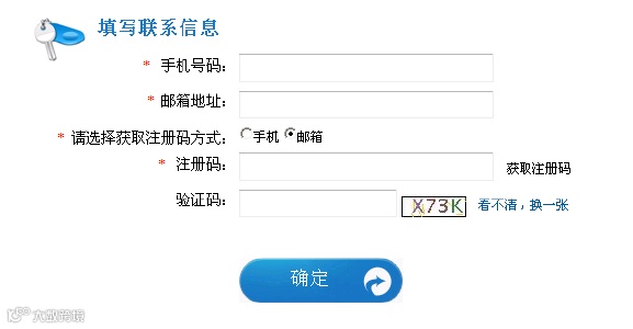 修改密码完成后,系统弹出填写联系信息页,提示并要求用户输入“手机号码”、“邮箱地址”、“注册码”、“验证码”,用户点击“确定”按钮。如图
