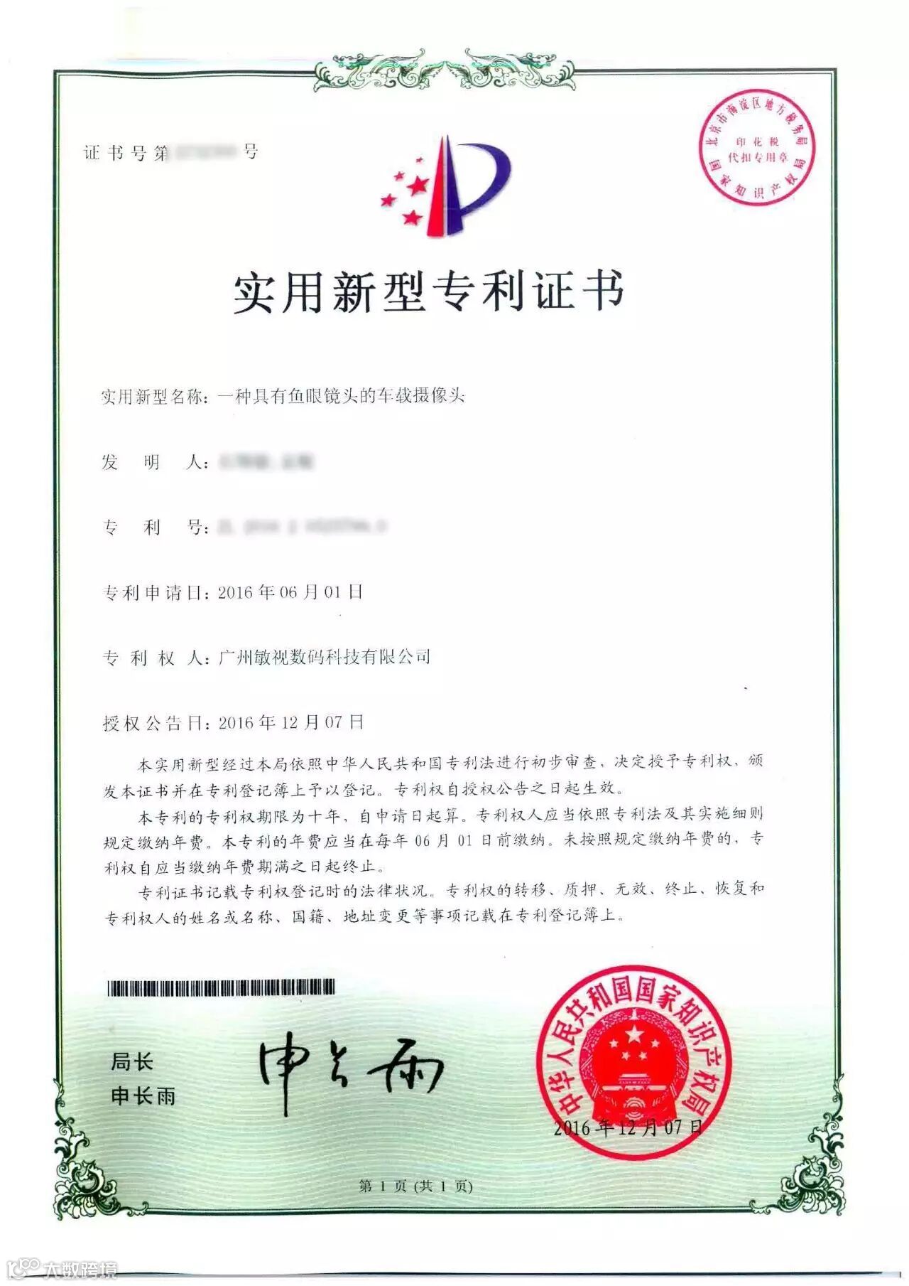近日,敏视获得国家知识产权局颁发的一项国家实用新型专利:一种具有鱼眼镜头的车载摄像头,为敏视的技术完善与创新事业再添佳绩!