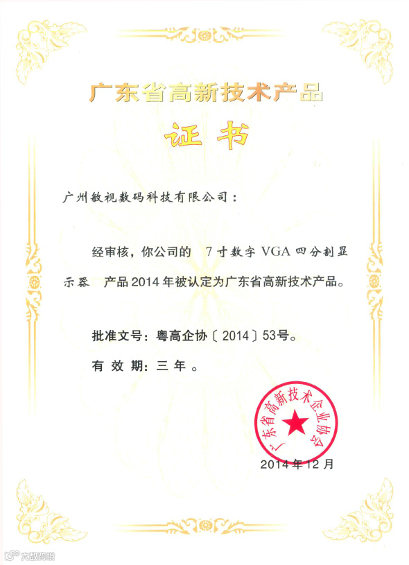 获得“广东省高新技术产品”证书,是省企业协会对我公司发展成绩的支持和肯定,也是客户和社会各界人士对我公司的关心和支持的成果,更是敏视人的聪明才智以及辛勤劳作的结晶。