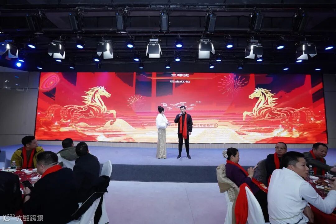 在温馨而庄重的时刻,公司总经理马总、胡总及各职能部门负责人共同登台,举杯向全体员工和来宾祝酒。这一杯,敬过往的奋斗与成绩;这一杯,敬当下的相聚与情谊;这一杯,更敬未来的征程与辉煌。全场共同举杯,将祝福与期盼融于酒中,为崭新的2026年许下美好愿景。