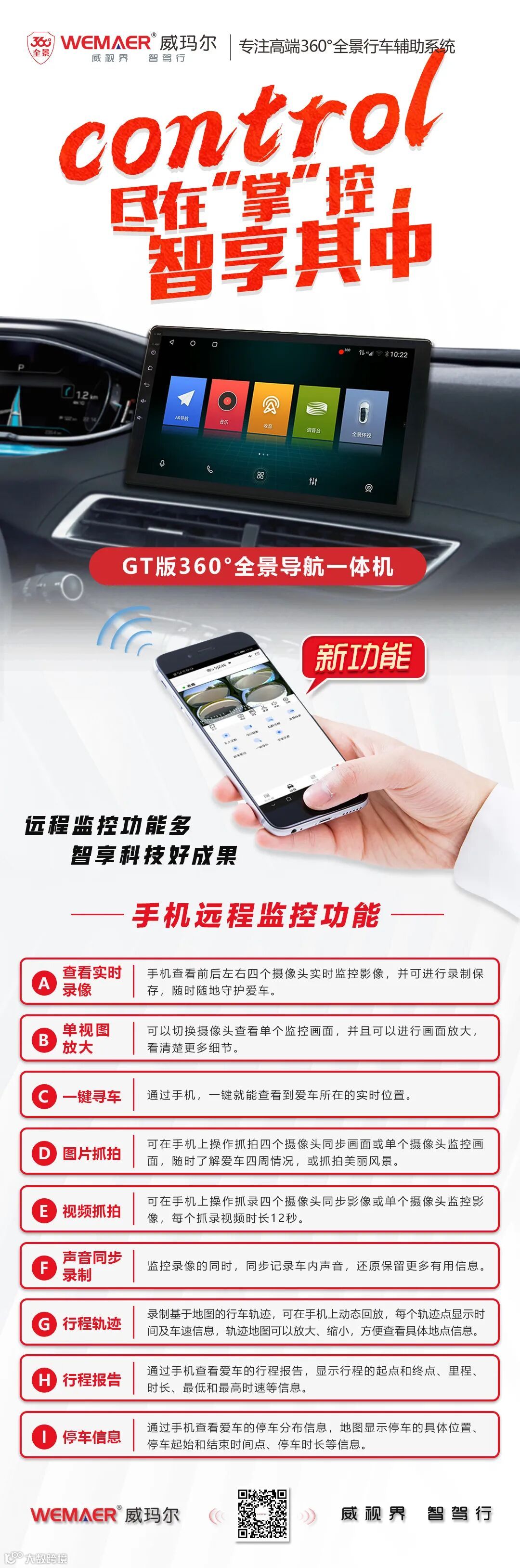 威玛尔GT版360°全景导航一体机手机远程监控功能,让车主可以用更科技的方式守护爱车。