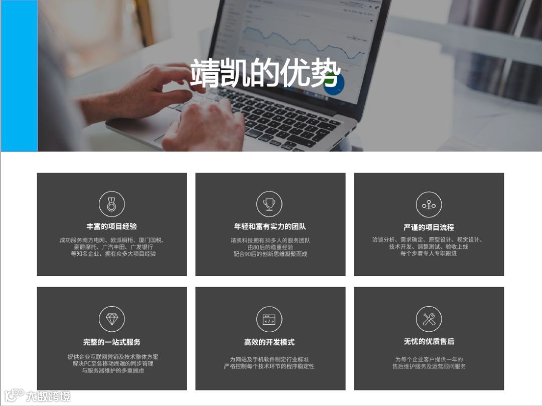 面对市场的复杂多变,靖凯科技拥有实力坚韧的研发团队及顶尖素养的设计人才,为企业提供全方位的“视觉策略、技术体验、行销管理”的互联网整体解决方案.靖凯科技秉持专注、创新、共赢的精神,并将一如既往地致力于携手客户追求创造卓越未来!