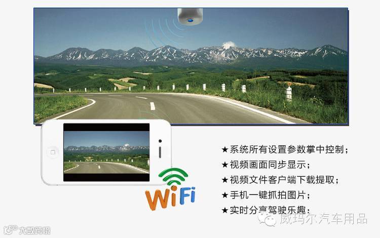产品内置WiFi路由,手机安装APP后,可通过WiFi连接行车记录仪,手机就能方便。实时查看录像视频不费流量,通过系统WiFi零流量下载传输。