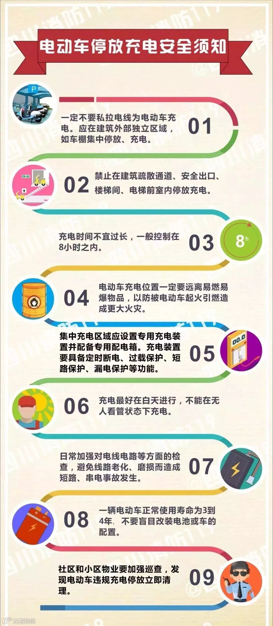 消防部门建议,有条件的地方,可以设立电动车智能充电桩。提醒车主:电动车一般夏天充电6-8小时,冬天充电8-10小时为宜,电池不宜过度放电。绝不私拉电线充电。电动车电池使用年限为1.5年-2.5年,注意定期更换电池,避免安全隐患。