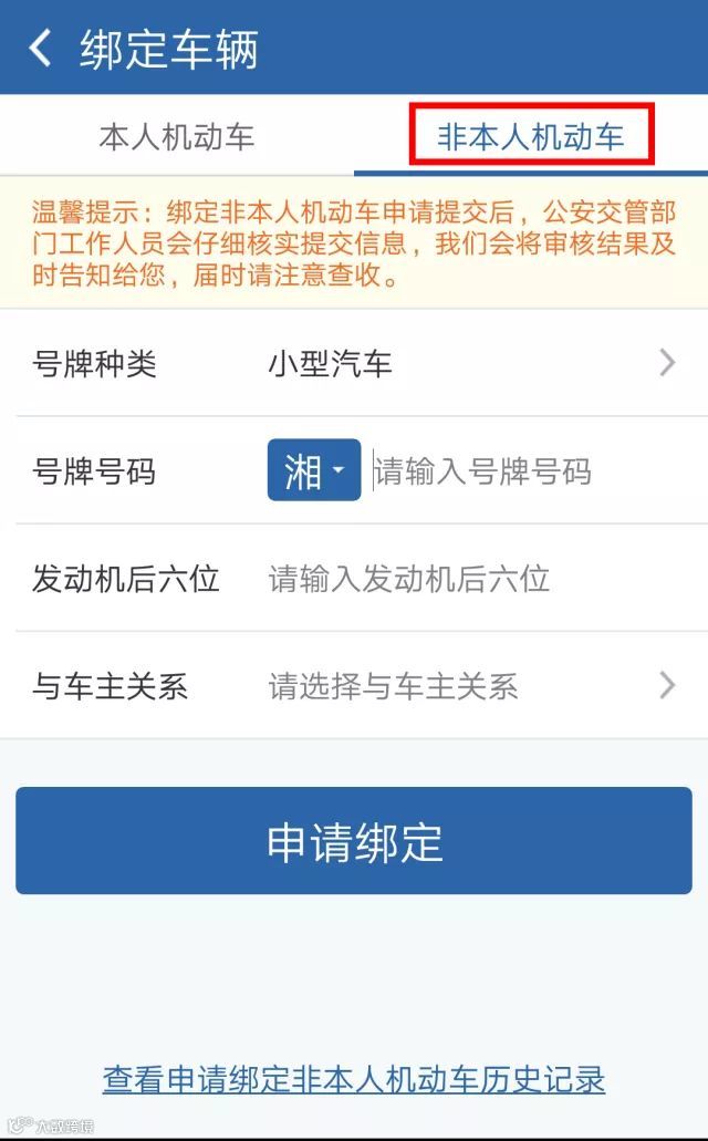 第二步:在首页选择“机动车”进入绑定车辆页面,选择“非本人机动车”,按照提示提交相应的资料信息: