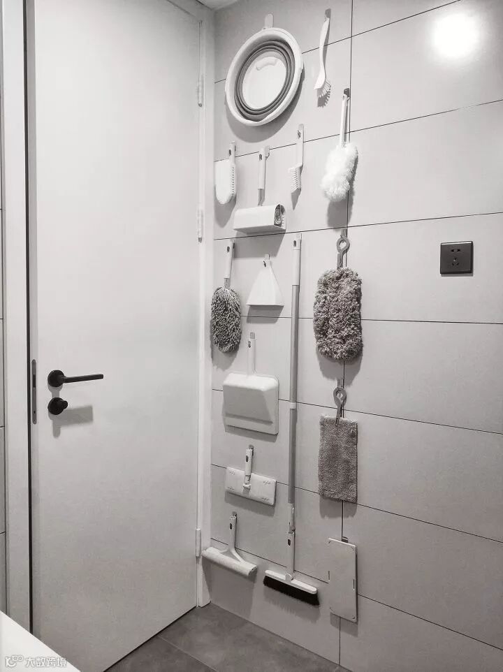 说到拖把、扫帚之类的也是一样的道理,可以抛弃传统那种『爆炸头』大拖把,选择颜值更高的产品。像上图这样整齐的挂在卫生间门背后也是很好的收纳办法。当然,这种只适合『轻微强迫症』,多数人都没这么勤快。