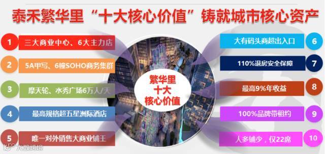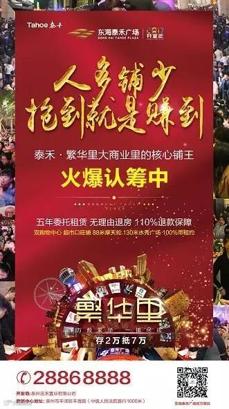 除三大商业中心提供大量消费客群外,【繁华里】自身同样拥有强大的品牌号召力。现已100%满铺招商,如中国黄金、黄金码头等一批黄金珠宝店均已抢先入驻。而泰禾集团为【繁华里】推出的5年委托租赁、无理由退房、110%退款等多项投资保障政策,则极大的提升了投资顶级商业的安全性,为投资者们解决“后顾之忧”。除此之外,9月30日东海泰禾广场璀璨开业,也为【泰禾·繁华里】形成了即买即收益的财富保障。