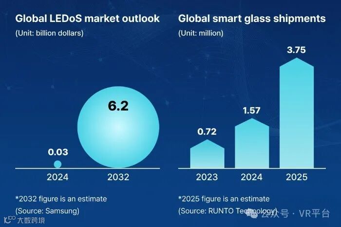 这一技术优势正引起硬件制造商的兴趣,他们希望打造轻巧、可穿戴的 AR 设备,在现实世界中提供无缝的数字叠加。 AR 眼镜是增长战略的核心三星进军 LEDoS 领域的动力源于看好的长期市场前景。业内预测估计,LEDoS 市场的规模将从 2023 年的 3000 万美元增长到 2032 年的 62 亿美元以上。