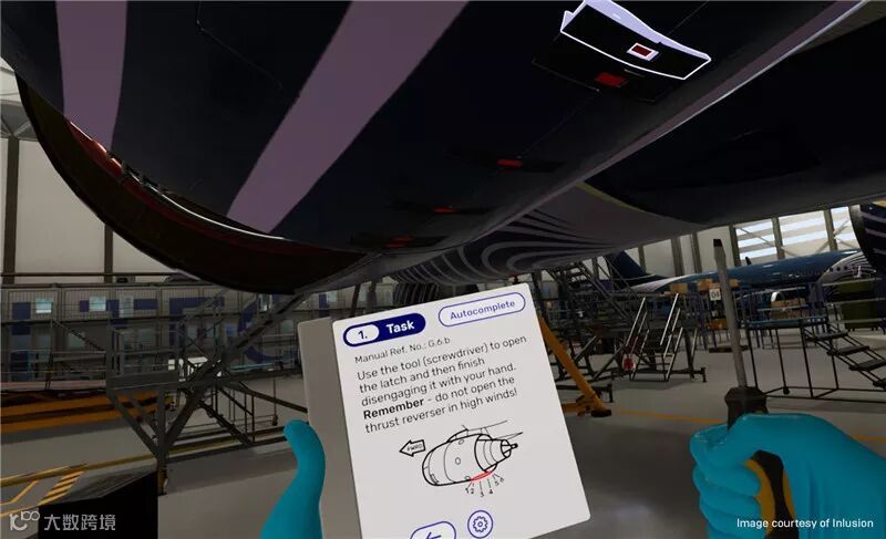Inlusion与FL技术公司合作的结果是为波音737建立了一个VR培训系统,利用这个培训系统,机械师可以通过使用飞机手册中的程序来打开推力反向器。