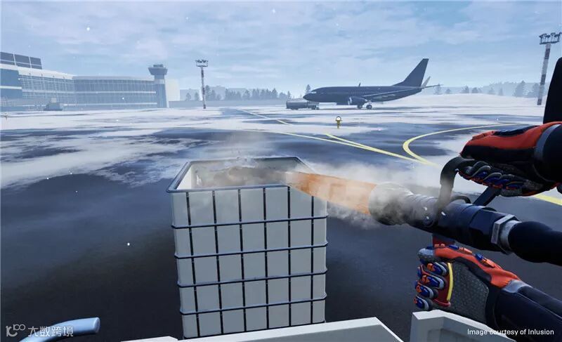 除冰和防冰程序是VR中航空维修培训的另外一课。这些程序要求机组人员向飞机上喷洒特定数量的液体化学物质,用一只手举起起重机,同时用另一只手喷洒。除了精度之外,速度也是一个因素,因为这个过程通常是在飞机接近起飞时间时进行的,必须要求快速和精准!