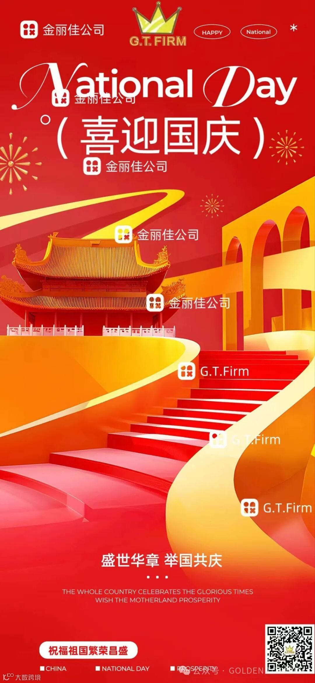 金丽佳公司喜迎国庆75周年!今年的中国国庆节假期为2024年10月1日至10月7日。金丽佳公司将按照官方公布的假期安排进行休假。
