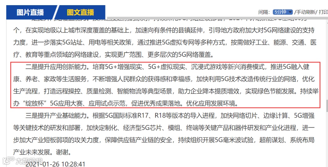 以下为发布会文字摘抄:提升应用创新能力。培育5G+增强现实、5G+虚拟现实、沉浸式游戏等新兴消费模式,推进5G融入健康、养老、家政等生活服务,不断增强人民群众的获得感和幸福感,加快利用5G技术改造传统行业的网络,优化生产流程,打造远程操控、质量检测、智能物流等典型场景,助力企业降本提质增效,实现绿色节能发展。持续举办“绽放杯”5G应用大赛、应用试点示范,促进优秀成果落地。优化应用发展环境。