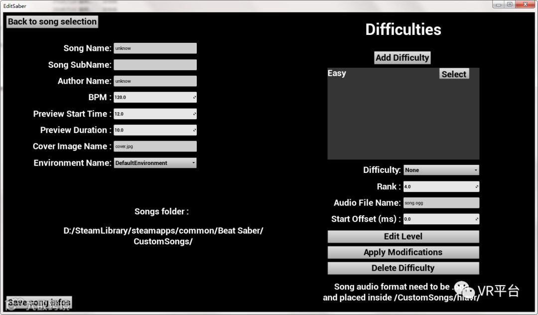 当然,介于beatsaver曲库中中文歌曲太少或找不到心仪的歌曲,国外大神还进一步开发了一款曲谱编辑器BeatSaberEditor,该编辑器可以帮助玩家更改曲谱或是将自行下载的OGG(可通过格式转换软件将MP3转换为OGG格式)音频文件创建一个曲谱: