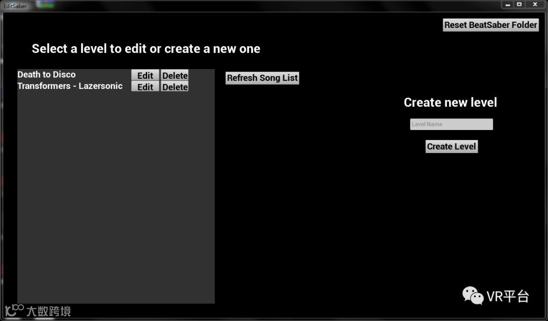 ·这时该编辑器左侧就显示了你可以编辑的曲库目录了,点击Edit即可编辑已有曲目,而右侧Create Level则是创建新曲谱。
