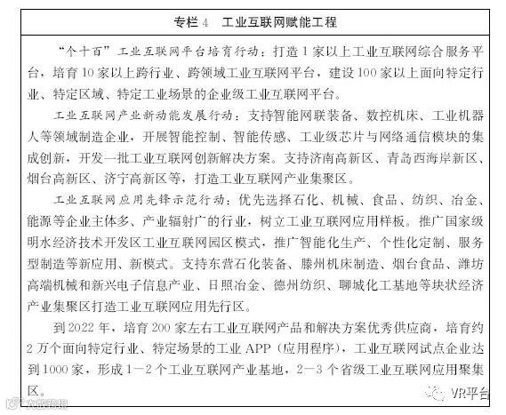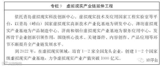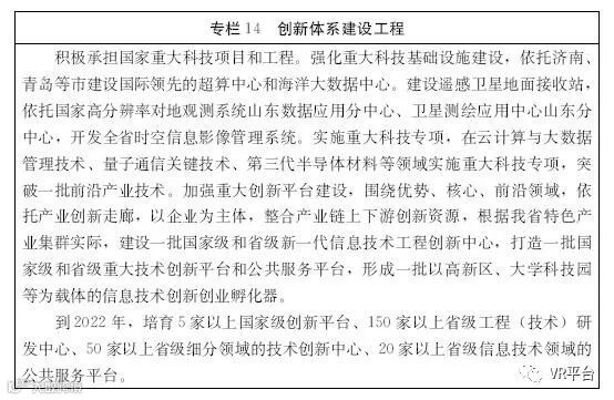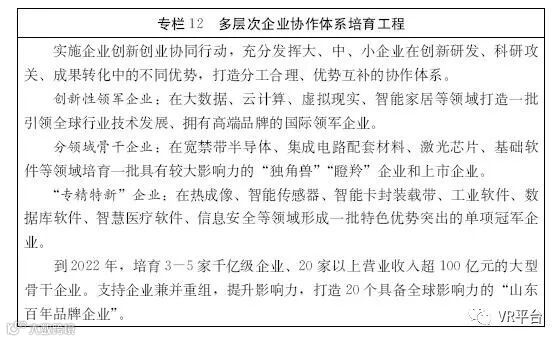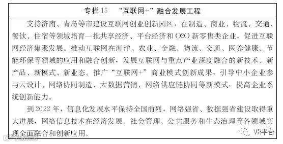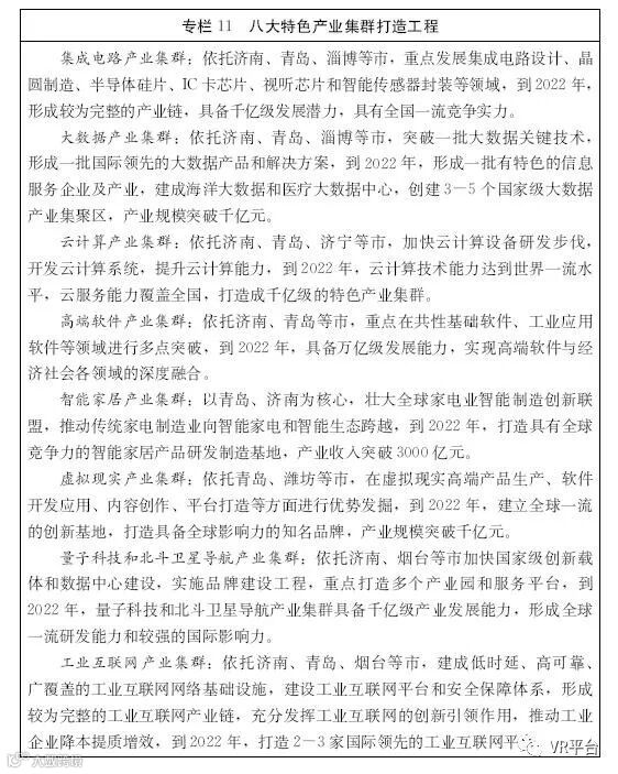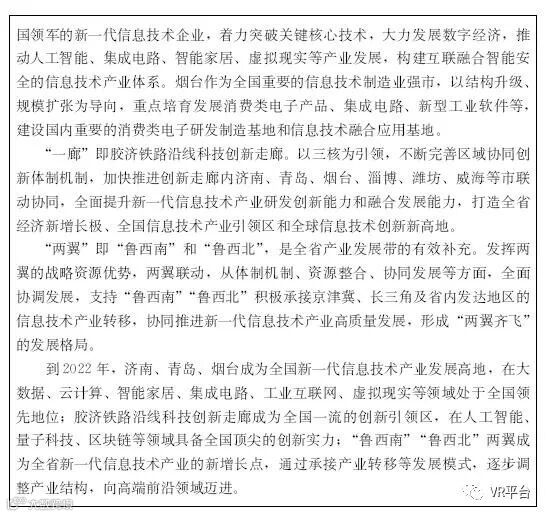 日前,山东省政府印发了《山东省新一代信息技术产业专项规划(2018-2022年)》,该规划中明确指出要做优虚拟现实产业。充分发挥我省在虚拟现实产业的优势地位,培育一批具有市场竞争力的虚拟现实企业,构建涵盖工具与设备、内容制作、分发平台、行业应用和相关服务的完整产业链。强化技术攻关,加强动态环境建模、新型显示和传感器、系统开发工具、实时三维图形生成、多源数据处理等技术的自主研发能力。拓展行业应用,推进虚拟现实与工业设计、健康医疗、建筑设计、地质勘探、智能交通、文化教育、生活娱乐等领域的融合创新发展。健全虚拟现实技术标准与测试验证体系,制定适用于虚拟现实的传感、通信、芯片、显示、交互等关键环节技术标准。全文如下: