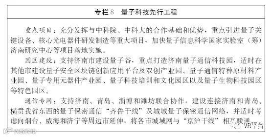 2.推动量子科技和北斗卫星导航产业创新发展。聚焦量子通信、量子测量、量子计算等领域,加强量子调控和量子信息战略性研究,推进量子功能材料和器件研发。建设基于量子密码的新型安全通信网络体系和国家级量子通信网络基础设施共享服务平台,开展量子通信安全、核心关键器件等领域的科技攻关和产业化。积极研发城域、城际、自由空间量子通信技术,开展量子通信网络运营,推动实现量子通信产业化。探索开展量子精密测量和量子计算机研究,推动量子测量应用成果的产品化和量子计算机的物理实现。构建量子技术应用场景和标准,大力推动量子技术在国防、金融、政务、商业等领域的应用。支持济南市建设国际领先的量子技术研发和产业化基地。加大北斗接收机芯片、基带芯片、天线等基础技术研发力度。依托省卫星定位综合服务运营中心,建设全省卫星导航定位基准站网。建设时空信息平台和大数据中心,推进多领域北斗应用示范,促进多种形式的北斗数据深层次应用开发,挖掘位置数据服务的增值效益。