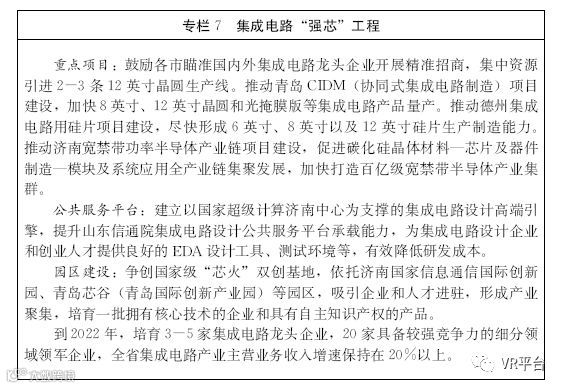 1.提升集成电路产业发展水平。按照“先两头(设计、封装测试)、后中间(制造)”的发展思路,巩固材料环节优势,壮大设计、封装测试环节,全力突破制造环节,打造集成电路“强芯”工程,形成集成电路材料、设计、制造、封装、应用的完整产业体系。面向物联网、云计算、工业控制、汽车电子、医疗电子、金融、智能交通等需求大的领域,推动设计企业与整机企业开展合作,重点开发EDA(电子设计自动化)工具、高端存储芯片、数字音视频处理芯片、热成像芯片、FPGA(现场可编程门阵列)芯片、信息安全和激光芯片等产品。依托济南、淄博等市产业基础,建成国内重要的IC卡芯片和MEMS(微机电系统)传感器封装测试基地。建设基于BGA(焊球阵列封装)技术的SIP(系统级封装)生产线,扩大中高端产品占比。积极引进高端集成电路制造企业,建设大规模集成电路晶圆生产线,填补制造环节短板,尽快形成较为完善的产业链。推动龙头企业做大做强,进一步强化集成电路用金丝、硅铝丝、封装载带等配套材料产业的国内优势地位。支持济南发展以碳化硅为代表的宽禁带半导体产业,建设宽禁带半导体小镇,打造全球领先的宽禁带半导体产业高地。