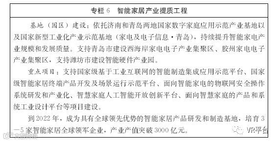 5.强化智能家居产业发展。依托青岛市智能家电产业优势,重点发展节能智能型和网络化冰箱、电视、空调、洗衣机、热水器等家用、商用电器,进一步完善技术标准和数字家庭系统解决方案,推动智能家电的普及。支持潍坊市发展微型麦克风、蓝牙耳机、主动式3D眼镜等为消费电子整机产业配套的关键器件、专用设备的研发及产业化。推进终端制造业与内容服务业融合发展,提升全产业链竞争力。以应用示范为载体,推动具有自主知识产权的标准、产品在数字家庭服务中的应用。