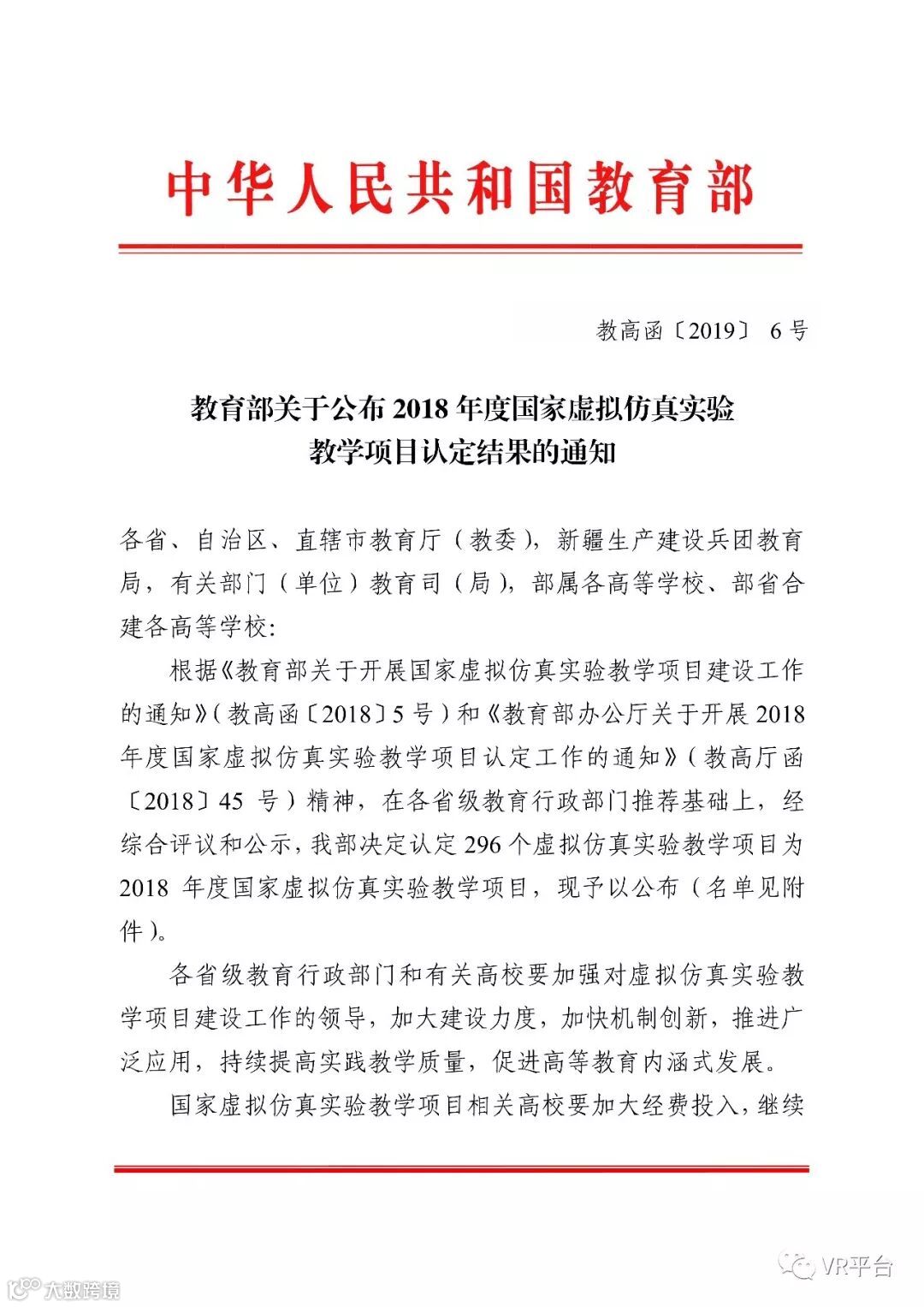 根据《教育部关于开展国家虚拟仿真实验教学项目建设工作的通知》(教高函〔2018〕5 号)和《教育部办公厅关于开展 2018 年度国家虚拟仿真实验教学项目认定工作的通知》(教高厅函〔2018〕45 号)精神,教育部决定认定 296 个虚拟仿真实验教学项目为2018 年度国家虚拟仿真实验教学项目。