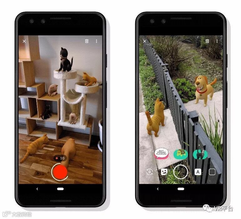 由于ARCore的扩展能力,放置在同一场景的AR狗和猫会好奇地凝视对方,然后友好地打招呼。谢天谢地,看多了《汤姆和杰瑞》的小编,很欣喜AR中的两只动物都对彼此很友好。