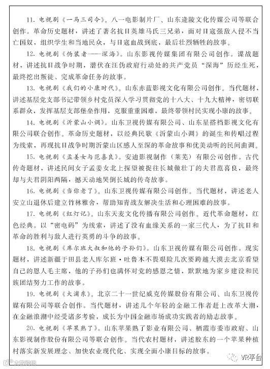 实施省级影视精品推进计划,到2022年扶持创作生产100部优秀影视剧,推动我省影视业持续繁荣。突出重大主题创作,围绕改革开放40周年、新中国成立70周年、全面建成小康社会、建党100周年等党和国家重大宣传期和宣传节点,创作生产一批讴歌党、讴歌祖国、讴歌人民、讴歌英雄的优秀影视精品。继续发扬鲁剧弘扬主旋律、关注现实生活的优良传统,进一步展现社会变迁和人物群体命运、反映普通人追梦中国、追求幸福生活的平民叙事,讲好新时代中国故事。进一步支持农村、少数民族、少儿、优秀传统文化等体现公益导向的影视作品。支持“小成本、大情怀、正能量”的影视作品。