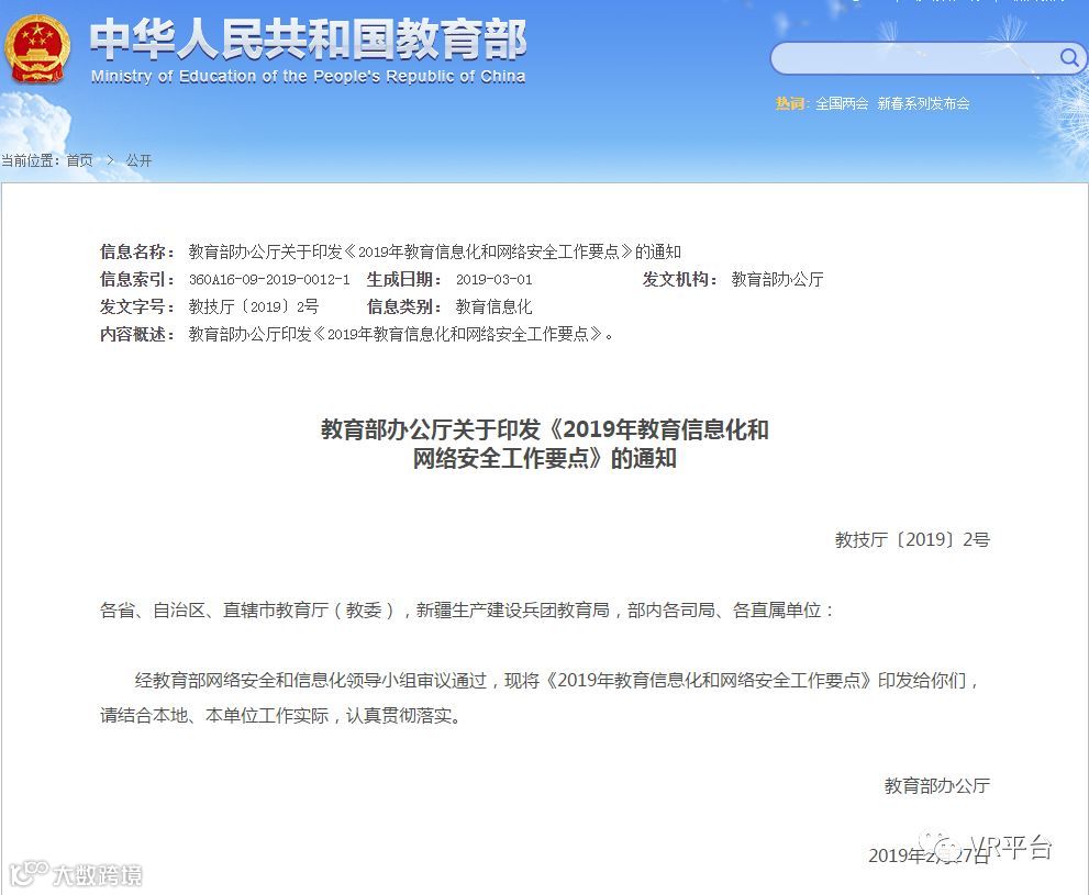 据教育部官方网站消息,教育部办公厅发布关于印发《2019年教育信息化和网络安全工作要点》的通知。
