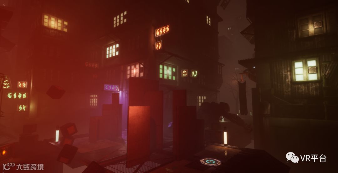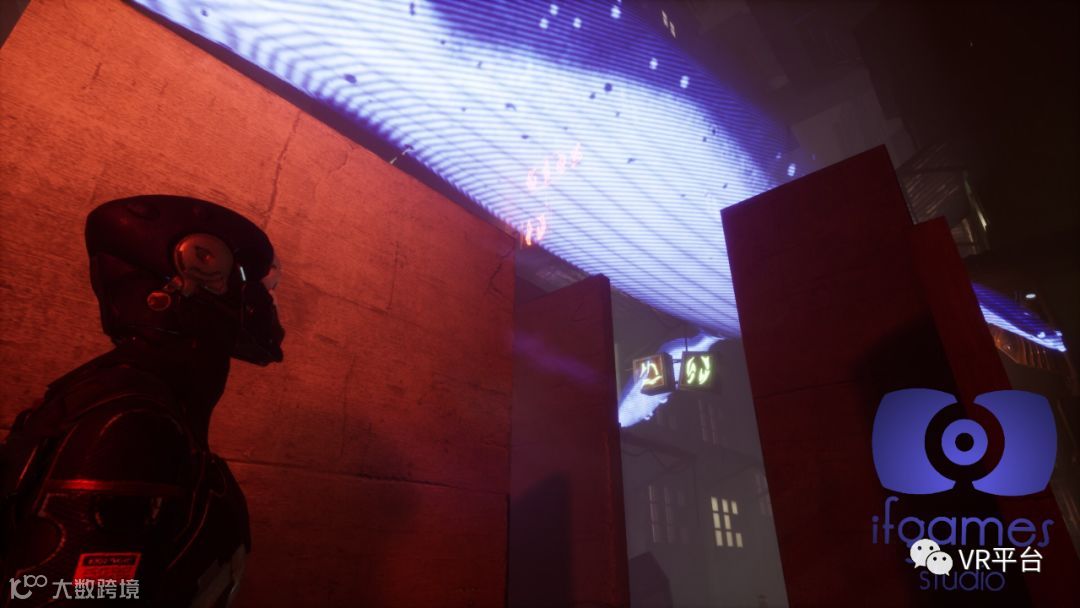 定位精准,配合游戏的画面和音效,可谓沉浸感十足。游戏场景充满赛博朋克风格,比如抬头,会看到空中有着类似《攻壳机动队》电影的全息画面,而背景音乐也进一步提升了游戏的沉浸感。此外,相比其他大空间VR体验多采用Oculus Rift CV1头显,Vive Pro在佩戴的舒适度和显示清晰度上要更占优势。
