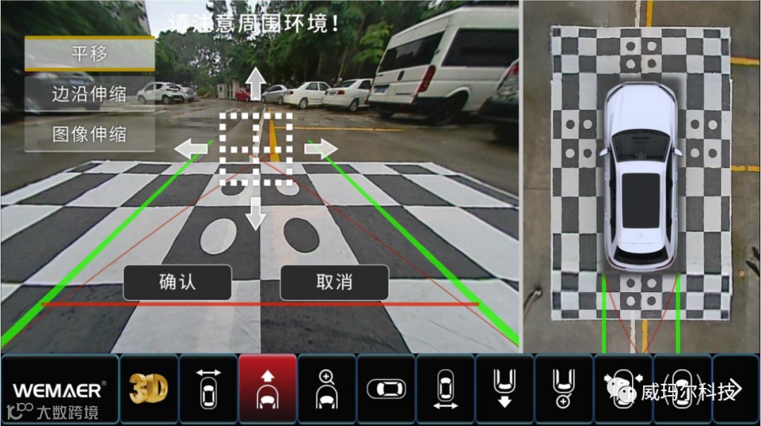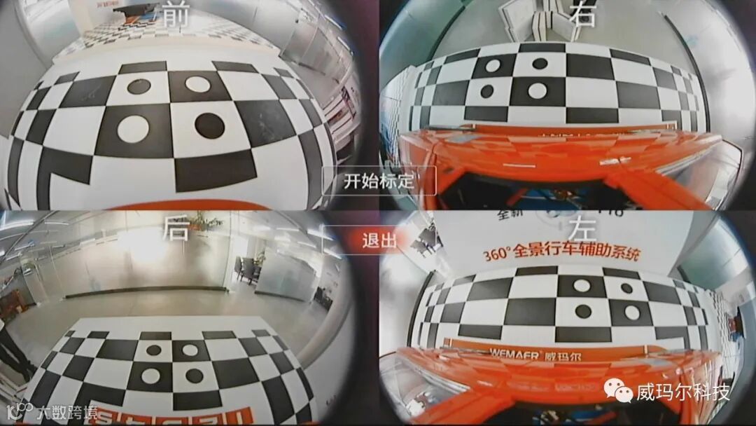 标定时,四个摄像头视图增加位置(前后左右)标记,可对单视图画面放大查看(触控屏情况下),并增加了“开始标定”、“退出”按钮选项,摄像头校正更加方便。