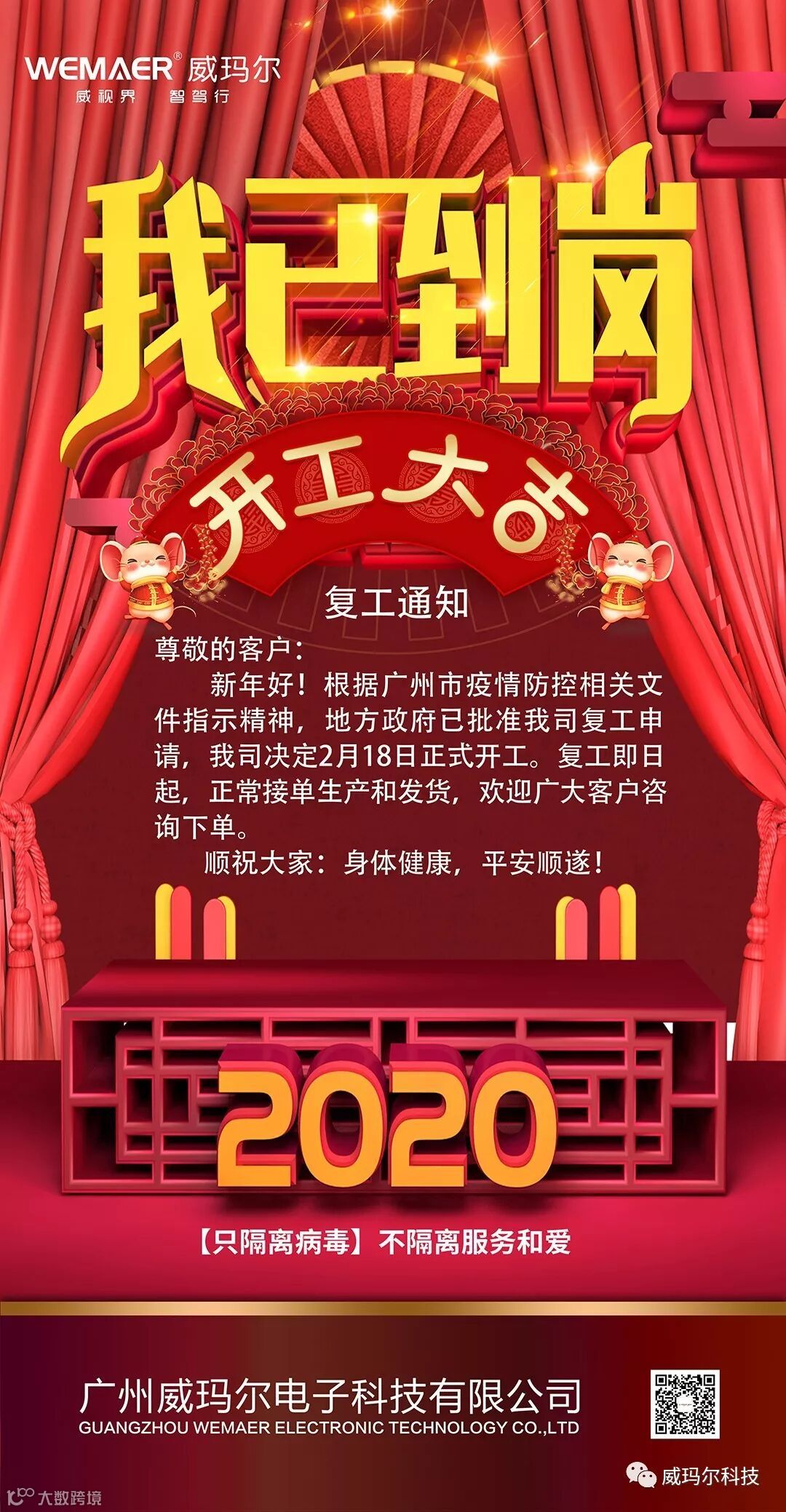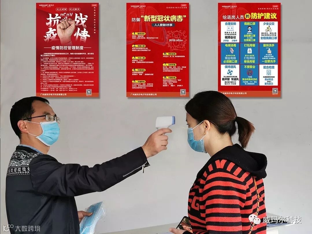 2月18日,威玛尔正式复工啦!特殊时期,威玛尔根据政府相文件精神,率先达到复工要求;本着对员工负责、对企业负责、对社会负责的原则,公司从每个细节抓起,加强疫情防控,关注员工健康,确保安全复工;有序安排生产,从源头架起第一道防线,让产品安全出厂,让广大客户买的安心、用得放心。