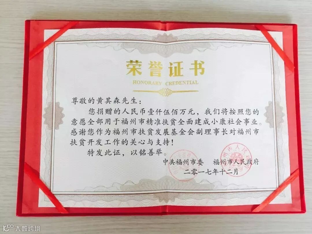 此前的2017年12月26日,福州市扶贫发展基金会正式成立,泰禾集团董事长黄其森任基金会副理事长,并获得“扶贫慈善企业家”称号。截至去年底,该基金会已筹集到企业家捐出的爱心善款7000万元。其中,泰禾集团捐赠的1500万元将全部用于“精准扶贫”领域。