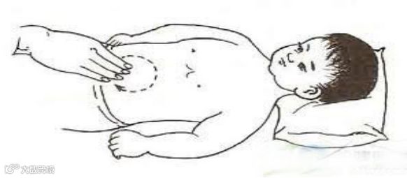 操作:宝宝仰卧,全身放松,家长用手按住腹部、手心对肚脐,顺时针方向绕脐揉腹10分钟,动作轻缓。摩腹具有改善脾胃功能,促进消化吸收的作用。
