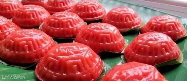 红龟粿 (像龟形,外染红色,打龟甲印,以象征人之长寿)