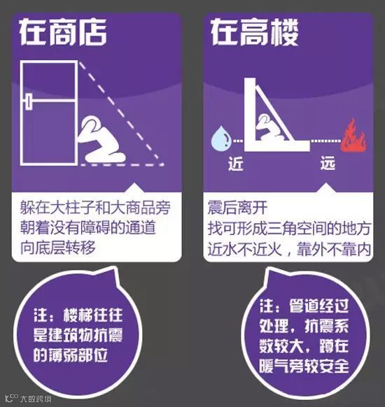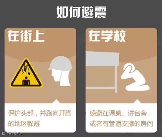 操场最安全: 在操场或室外时,可原地不动蹲下,双手保护头部,注意避开高大建筑物或危险物。
