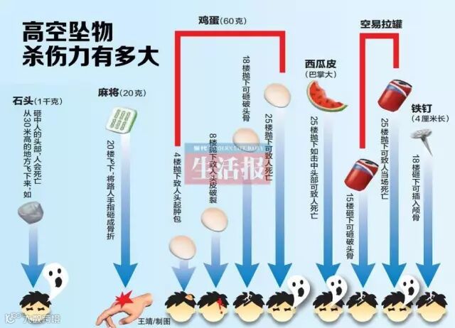30克的鸡蛋,从4楼抛下来会让人起肿包;从8楼抛下来就可以让人头皮破损;从18楼高甩下来就可以砸破头骨;从25楼抛下可使人当场死亡。