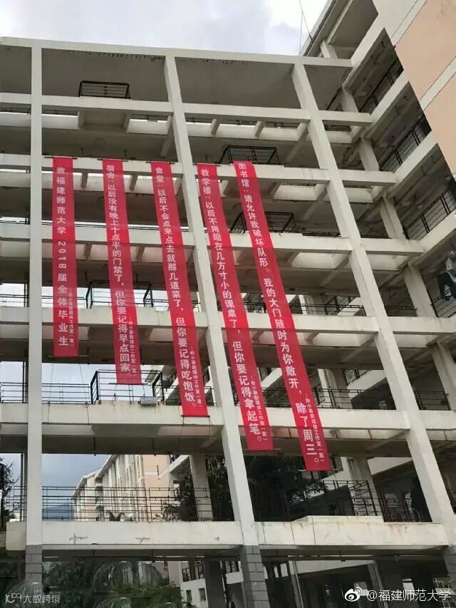 @福建师范大学:用5条横幅打出完美的温情牌,尤其是食堂横幅:以后不会点来点去就几道菜了,但你要记得吃饱饭。用美食这一招,小编承认你赢了!