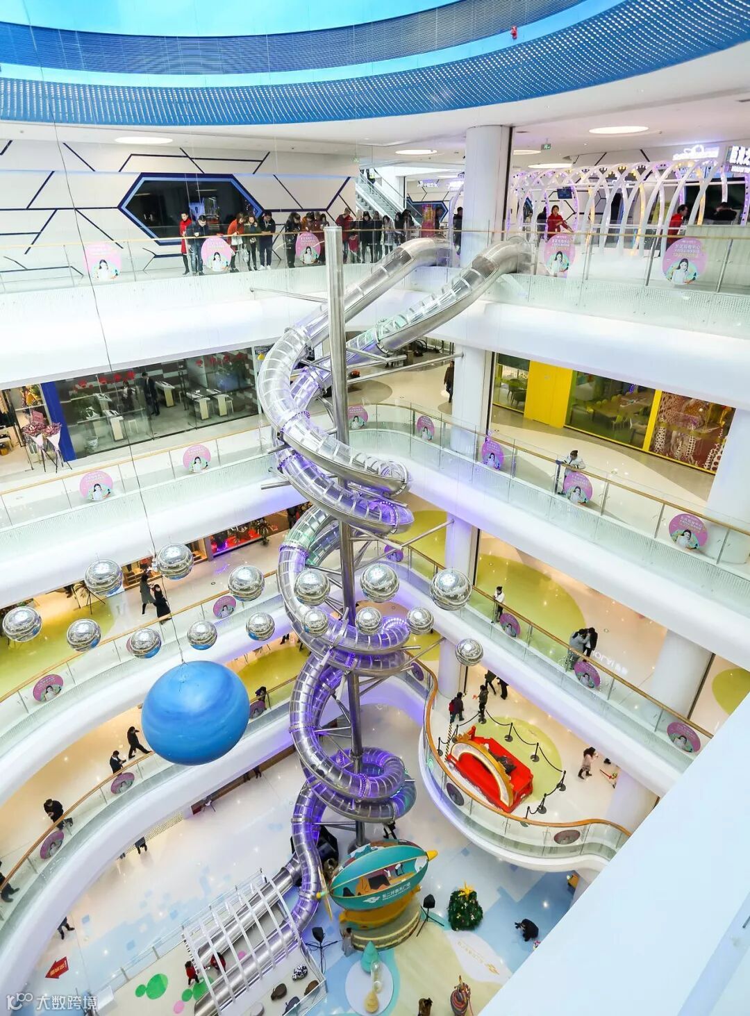 不同于很多开发商做商业主打“跑量”的思路,东二环泰禾广场很注重主题场景的打造。以东区商场为例,商场中庭设有5层高的双轨滑梯“巨龙之旅”: