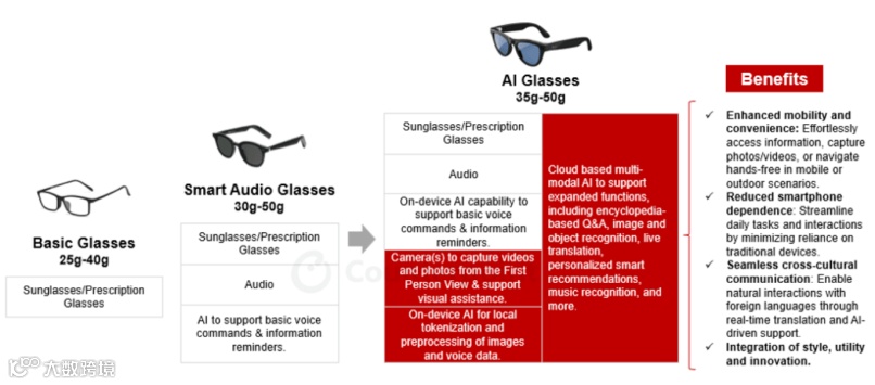 在最近的一份报告中,Counterpoint 将智能眼镜定义为与智能手机绑定在一起的眼镜,而 AI 眼镜则拥有自己的计算处理器,并配有专门的单元来处理 AI 任务,例如神经处理单元、数据处理单元或其他 AI 加速器,以运行微型 AI 模型并执行设备上的 AI 任务。