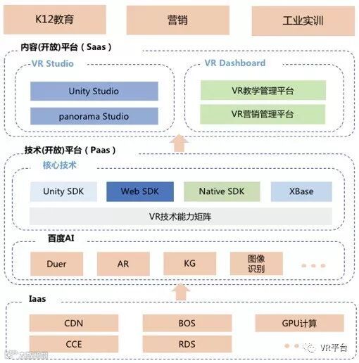 百度VR整体技术框架由内容平台、技术平台、Iaas平台构成,核心技术和创新则主要表现在UnitySDK、Web SDK、Native SDK、XBase等四个方面。