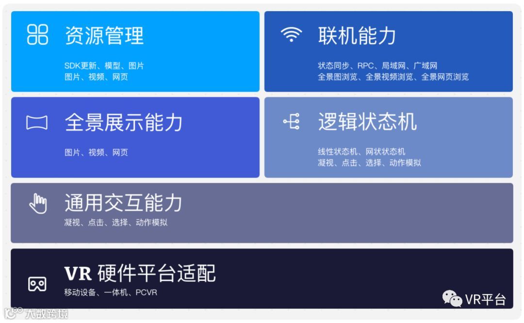 百度VR开发者套件核心能力矩阵主要包括VR 硬件平台适配、通用交互能力、逻辑状态机、联机能力、全景展示能力、资源管理。各项能力覆盖3D内容开发的各个方面,从前期策划到研发过程中的美术、程序部分,再到后期的运营管理。在3D内容的整个生命周期中全面积极的帮助合作伙伴和供应商适配多种硬件平台、减少重复逻辑的开发、降低时间成本、提升内容的质量和稳定性。