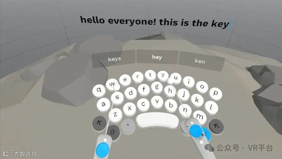 为了解决输入问题,很多VR平台尝试在虚拟空间中构建“虚拟键盘”,允许用户通过手柄、手势或视线点击方式输入文字。