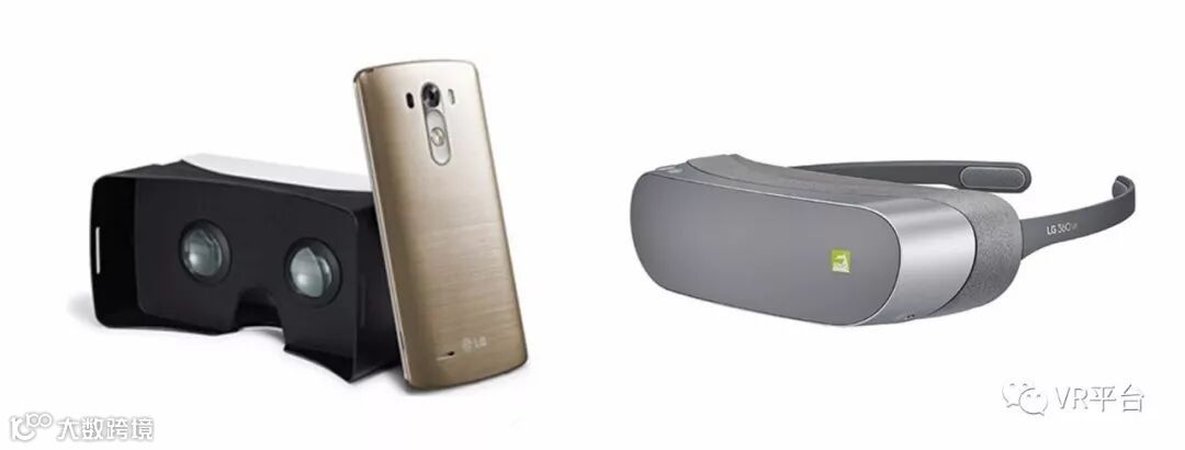 LG推出了两款手机VR设备,一款是售价129元的LG VR for G3,另一款是售价1799元的LG 360 VR。前者需要将手机塞入塑料材质的机匣来固定使用,左侧有一个钕磁铁环,用来搭配G3内建的陀螺仪用,无需触摸屏幕便能对手机进行操作,软件方利用了Google的VR平台。后者是LG在MWC 2016发布的。LG 360 VR相当于两个1.88英寸的显示屏,单眼分辨率960×720,机身上集成了两个按键,需用一根USB Type-C数据线与手机相连接,GPU和内容由手机提供。因为不需要插入手机,它得以保持相对迷你的身材,整体重量只有100g。但这个设备对于需要手机提供GPU和内容的VR设备来说,实在是没有什么竞争力。