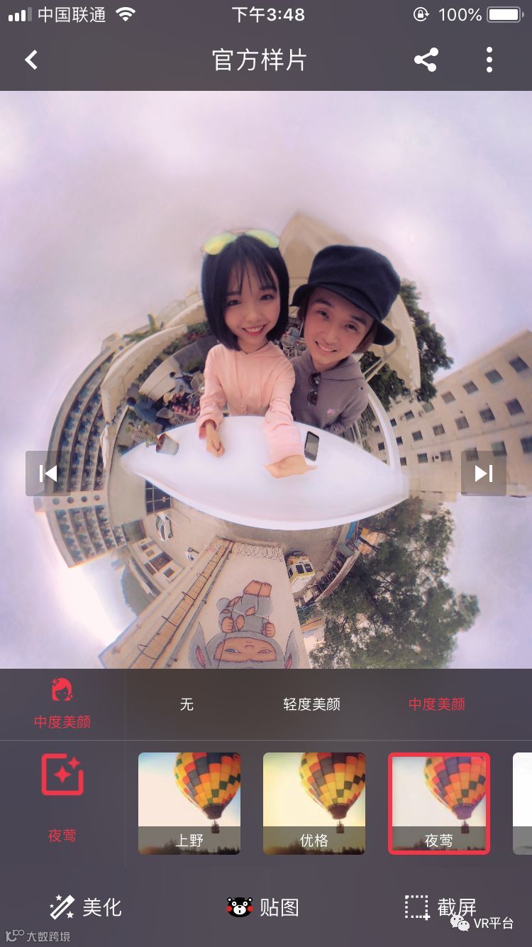 值得一提的是,完成拍摄后PanoClip全景可立拍APP还可允许用户用多种方式欣赏所拍摄的全景照片,并进行个性化的二次创作。更为重要的是——美颜、瘦脸、滤镜、贴纸、音乐等最新潮“抖音式自拍”的必备功能也一应俱全。