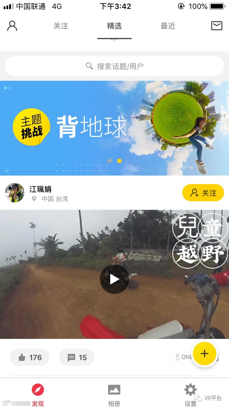 打开App后,VR网小编发现其UI继承了Insta360其他产品的设计风格,包含了“发现”、“相册”以及“设置”,所有功能一目了然。
