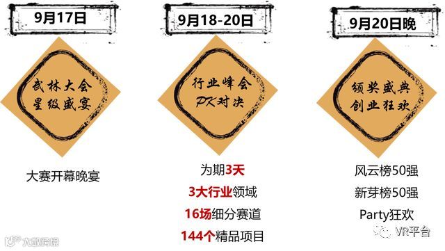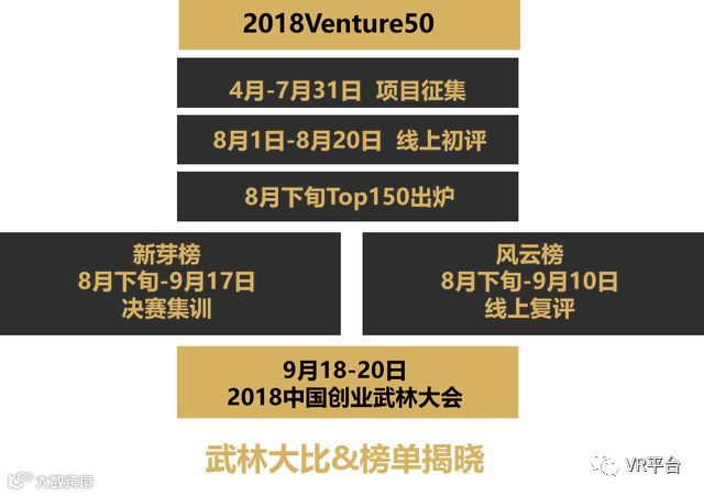 值得一提的是,为整合多方资源,搭建共享平台,VR网(微信公众号:VR平台)作为本次2018中国创业武林大会(Venture50)的合作方,也将与VR/AR企业共同成长,同谋福利。凡有意参加大会的VR企业,可添加文章下方微信优先参与评比。