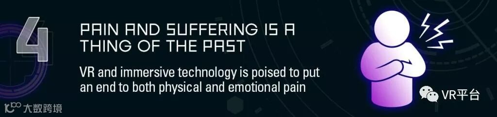 VR/AR等沉浸式技术正准备结束人们身体和情感上的痛苦。据GlaxoSmithKline全球数字产品负责人Chimeren Peerbhai称,“VR能够为痛苦的治疗过程提供分心治疗法,而临床实验证明,这对于那些癌症患者或烧伤病人非常有效。”此外,还有一些研究显示VR可以治疗PTSD、焦虑或成瘾等心理疾病。