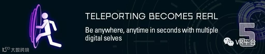 无论何时何地,只需几秒钟就可以使用多个数字化身。VP Capital创始人Viktor Prokopenya认为:“我们将拥有一个完整的虚拟形象,而非以往那种简易的化身,而旅途时间几乎为零。”目前,研究人员们已经在研究如何将虚拟化身瞬间传送到高保真的3D虚拟世界中了。将此功能与AR技术相结合,将虚拟化身传送到一个真实的位置并不是天方夜谭。