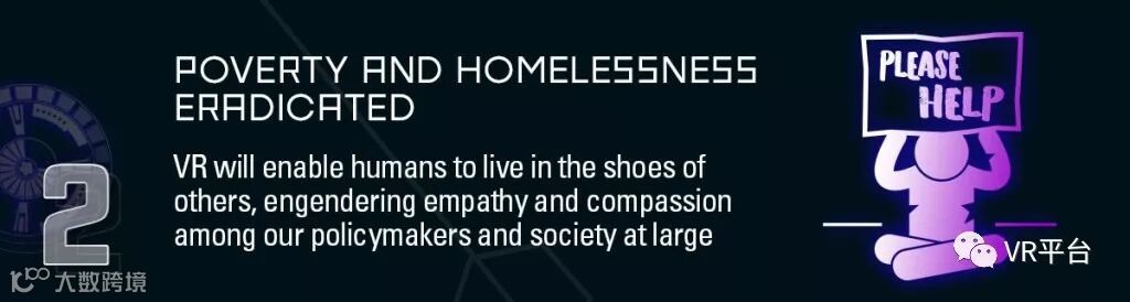 VR技术可以允许人们体验其他人的生活,从而让决策者或整个社会产生同理心和同情心。这将有助于社会福利、公民权利等两极分化的问题,每个人都能在争论中感受到双方的经历。