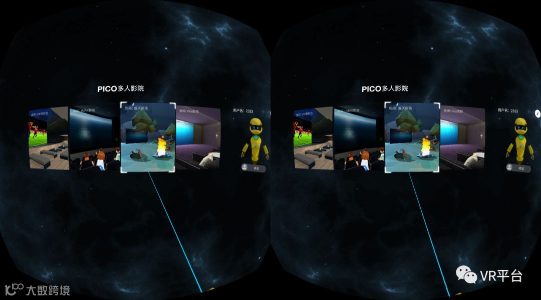 Pico多人影院:Pico多人影院是一个可同时支持多个用户在同一VR环境中观影的社交应用。目前该应用内置了四个场景:VIP观影台、IMAX影城、露天剧场、Pico影院,此外,用户还可以根据自身喜欢来设置虚拟形象,并可通过语音、动作和表情进行交流。